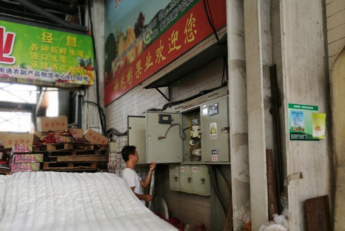 高溫天氣用電量逐漸增大,后勤工作中還是需要對交易區(qū)用電負(fù)荷進(jìn)行檢查。物業(yè)科電工對水果區(qū)、熟食區(qū)大棚里的配電總開關(guān)進(jìn)行了安全檢查,兩個區(qū)的總體用電情況相對良好,未出現(xiàn)總開關(guān)過熱、電流過大等危險(xiǎn)情況。對存在安全隱患的攤位,客服中心要求水果區(qū)責(zé)成經(jīng)營戶將配電箱及電線附近的雜物進(jìn)行整理,在配電箱旁邊預(yù)留一條通道,便于電工及時對配電開關(guān)進(jìn)行維護(hù),對違規(guī)用電、使用不合格電線等也向經(jīng)營戶提出了整改要求。