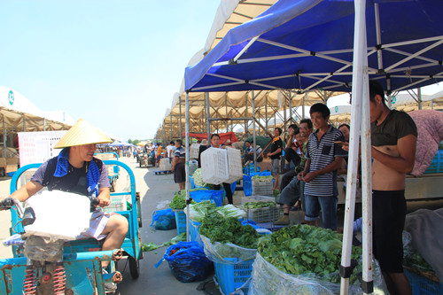 40歲的安徽人李金寶和他老婆一起在交易區(qū)賣菜,他說前年隨老鄉(xiāng)來到南通,在興仁包了50多畝地種植蔬菜,每天凌晨1點鐘起床,和老婆,另外請的兩個小工一起摘菜、裝筐、裝車到早晨8點鐘,然后開車40分鐘到通農(nóng)物流排隊、繳費,將近九點鐘開始賣,早晨在市場里買兩個大餅就著礦泉水當(dāng)早餐和中飯,下午賣得快的話兩三點鐘能賣完,最晚五點鐘收攤。他說今年氣溫特別高,夏天蔬菜不澆水要干死,白天泥土是燙的,不能給蔬菜澆水,即使晚上泥土也是熱的,給蔬菜澆水的時候,泥土上騰騰的冒熱氣,很多蔬菜差不多是被燙死的,所以產(chǎn)量特別低,價錢就貴,以前青菜0.2元/斤的時候,賣不出價錢,虧了,種菜賣菜也有風(fēng)險,但跟以前在建筑工地做小工比,好多了,以前苦累不算,還讓家人天天擔(dān)心,現(xiàn)在不去建筑工地了,和老婆來南通包地一起種菜賣菜,賺多賺少,家人不用擔(dān)心,通農(nóng)物流還給臨時經(jīng)營戶搭建了大棚遮陽,這比在露天建筑工地做小工日子好過多了,而且通農(nóng)物流還為外來經(jīng)營戶子女開辦了暑期輔導(dǎo)班——蒲公英成長園,就在水果交易區(qū)會議室,送過去很方便。南通大學(xué)志愿者和通農(nóng)物流的年輕員工義務(wù)給孩子輔導(dǎo)暑假作業(yè),讓大家可以安心經(jīng)營。