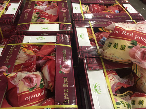 柚子在秋季大量上市,汁多味甜,含有維生素C,清新的香氣又能消解中秋節(jié)飲食的油膩,是深受市民喜愛的水果。八號大棚柚子專賣區(qū)在售的柚子產(chǎn)地以福建平和為主,品種為蜜柚,又為白肉、紅肉2種。蜜柚表皮比較光滑,個頭比較大,體型相對較圓,口味酸甜適中。挑選的時候,可以將個頭相當?shù)蔫肿拥嘣谑稚媳容^,掂起來感覺比較重,有分量,說明這只柚子含水量高,同時,市民也要避免購買上下兩端有裂紋的柚子。