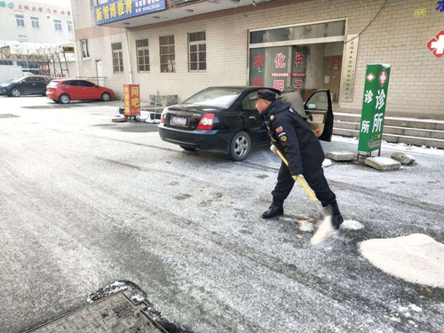 另一方面對(duì)所有的公共路面進(jìn)行撒鹽,對(duì)路面起到一個(gè)防凍防滑的作用。通過18名保安隊(duì)員2個(gè)多小時(shí)的辛勤奮戰(zhàn),一直到31日中午太陽(yáng)把路面冰雪全部融化后,安保部未接到有人在通農(nóng)物流內(nèi)因路面結(jié)冰路滑而摔倒的報(bào)告。