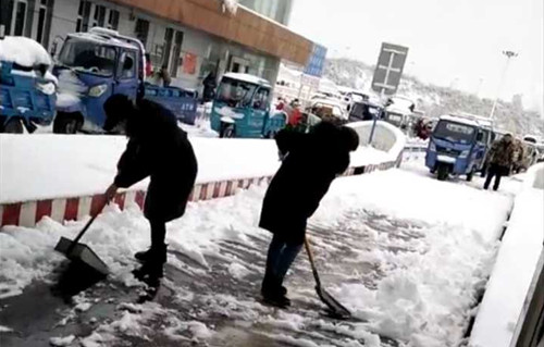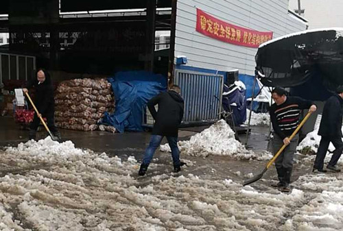 蔬菜區(qū)啟動惡劣天氣應(yīng)急預(yù)案,在崗員工紛紛拿起鐵鍬,頂著刺骨寒風(fēng)鏟掃厚厚的積雪,為經(jīng)營戶鏟出一條又一條安全通行道路;在彎道等重要路段撒鹽融雪,防止路面結(jié)冰,杜絕安全隱患;工作人員在棚內(nèi)加強安全巡查,做到防患于未然;利用場內(nèi)顯示屏、經(jīng)營戶微信群,提供安全提示,提醒經(jīng)營戶們做好防雪、防凍準(zhǔn)備,做到安全出行。
