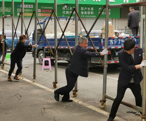 5月15日,由水果交易區(qū)經(jīng)理解雪峰帶頭,管理人員組隊(duì),集中到驗(yàn)車區(qū),移動(dòng)大棚,大家?guī)е痔?,喊著?hào)子,發(fā)揮不怕苦、不怕累的精神,齊心協(xié)力,將十四個(gè)大棚全部移動(dòng)完畢。