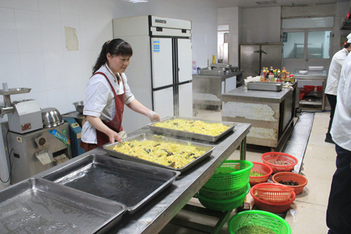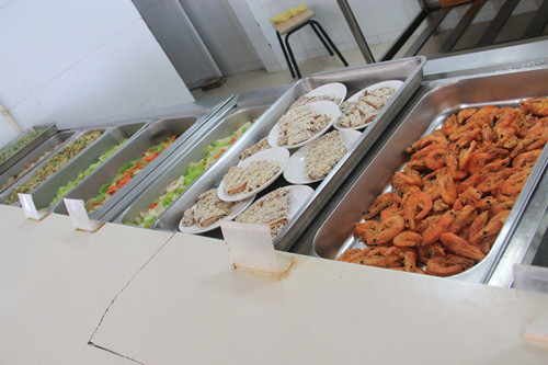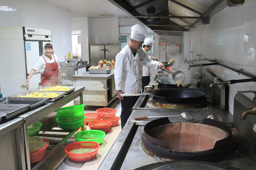 忙好早餐后,還沒來得及小喘一口,午飯的準(zhǔn)備工作又緊鑼密鼓地開始了。各種蔬菜、肉食及水產(chǎn)品要分揀清洗,按菜譜切配成盆,再準(zhǔn)備主食。一切都在有條不紊地進(jìn)行。上午10點(diǎn)左右,廚房里就成了決戰(zhàn)時(shí)刻的戰(zhàn)場,廚師們手持炒鍋,在爐灶邊揮汗如雨,不斷翻炒,一鍋又一鍋的菜肴隨之出鍋,香氣四溢,令人食指大動(dòng)。