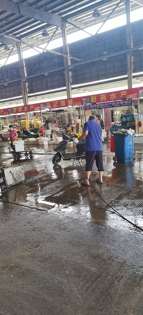 6月15日,水產(chǎn)肉類交易區(qū)主管范淵帶領(lǐng)當(dāng)班人員、保潔人員對交易場地地面進行了全面沖洗,同時對亂堆放進行了集中整治,還大家一個干凈、整潔的交易環(huán)境。(水產(chǎn)區(qū) 陳旭鵬)