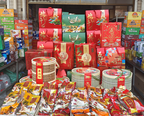端午節(jié)臨近,在干貨大廳的店鋪里粽子已悄然上市,有禮盒裝的、袋裝的,粽子禮盒琳瑯滿目。走進(jìn)店鋪內(nèi),店鋪老板在為顧客挑選、打包。店鋪老板推出了不同品牌、不同口味的粽子,袋裝粽子普遍售價(jià)在10元以下,禮盒裝粽子價(jià)格在50元到80元不等,口味以傳統(tǒng)的白米、鮮肉、蜜棗、蛋黃、豆沙為主。