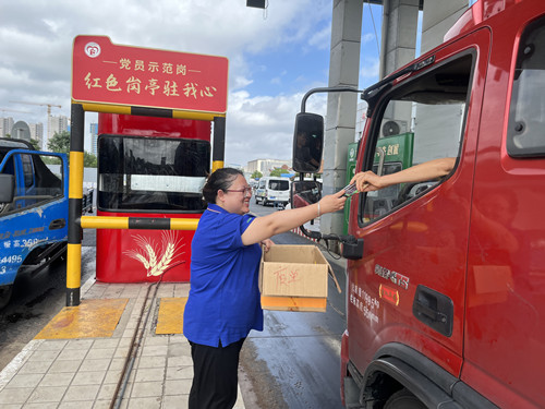 蔬菜區(qū)道閘收費口的工作人員們早早準備好了清涼解暑的礦泉水、冰棍等物品。當駕駛員駕駛車輛進入南門收費區(qū),黨員便熱情地迎上去,遞上一瓶清涼的礦泉水,送上一根清涼的冰棍,同時不忘詢問駕駛員的身體狀況并提醒他們注意防暑降溫?!皫煾?,您辛苦了!快來喝口水,解解暑!”一句句貼心的問候,讓駕駛員師傅們疲憊的臉上綻放出了開心的笑容。一位駕駛員接過礦泉水,感動地說:“這么熱的天能收到你們的關心,真的太感謝了!”